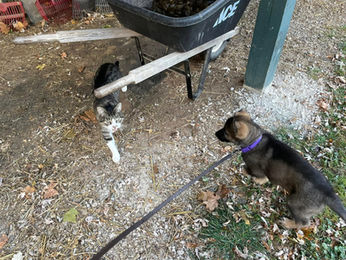 On top of the constant parade of human visitors, our pups are well socialized with dogs through interactions with our pack of expert puppy raisers. We have been blessed with multiple generations of dogs who are happy to take on puppy babysitting duties and always enjoy puppies, providing not only additional playmates but also important lessons in canine social behavior, communication and manners.